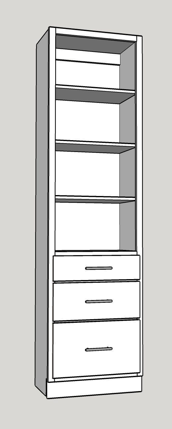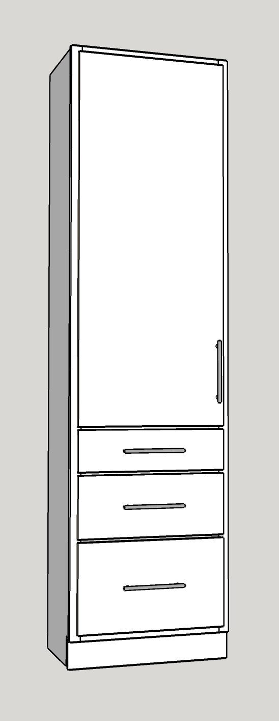 The standard design includes a closed-off upper cabinet with a clothing bar to hang clothes and three drawers